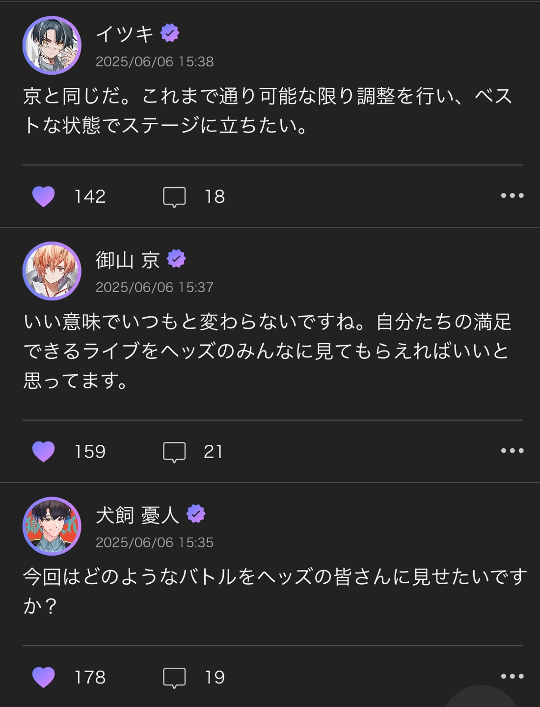 이츠키 : 케이와 같은 의견이다. 지금까지 그래왔던 것처럼 가능한 한 조정해서 최선의 상태로 스테이지에 서고 싶어.